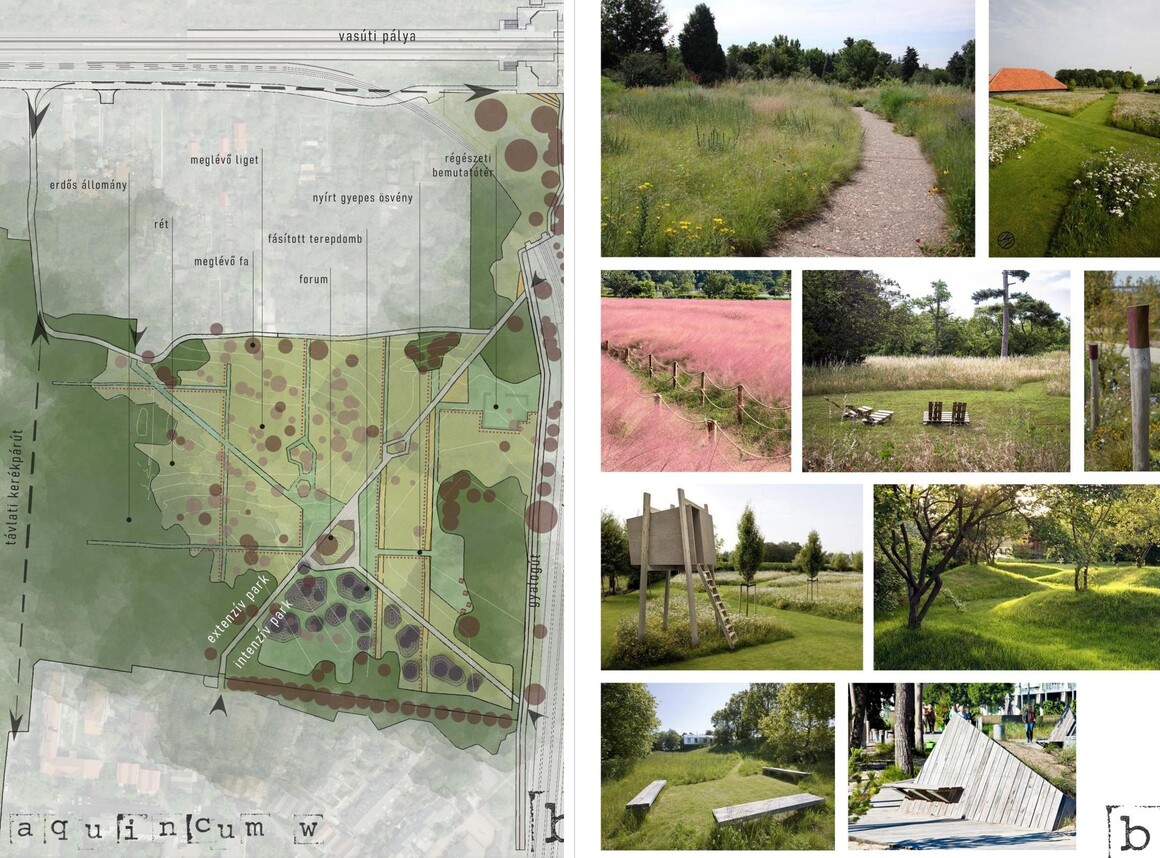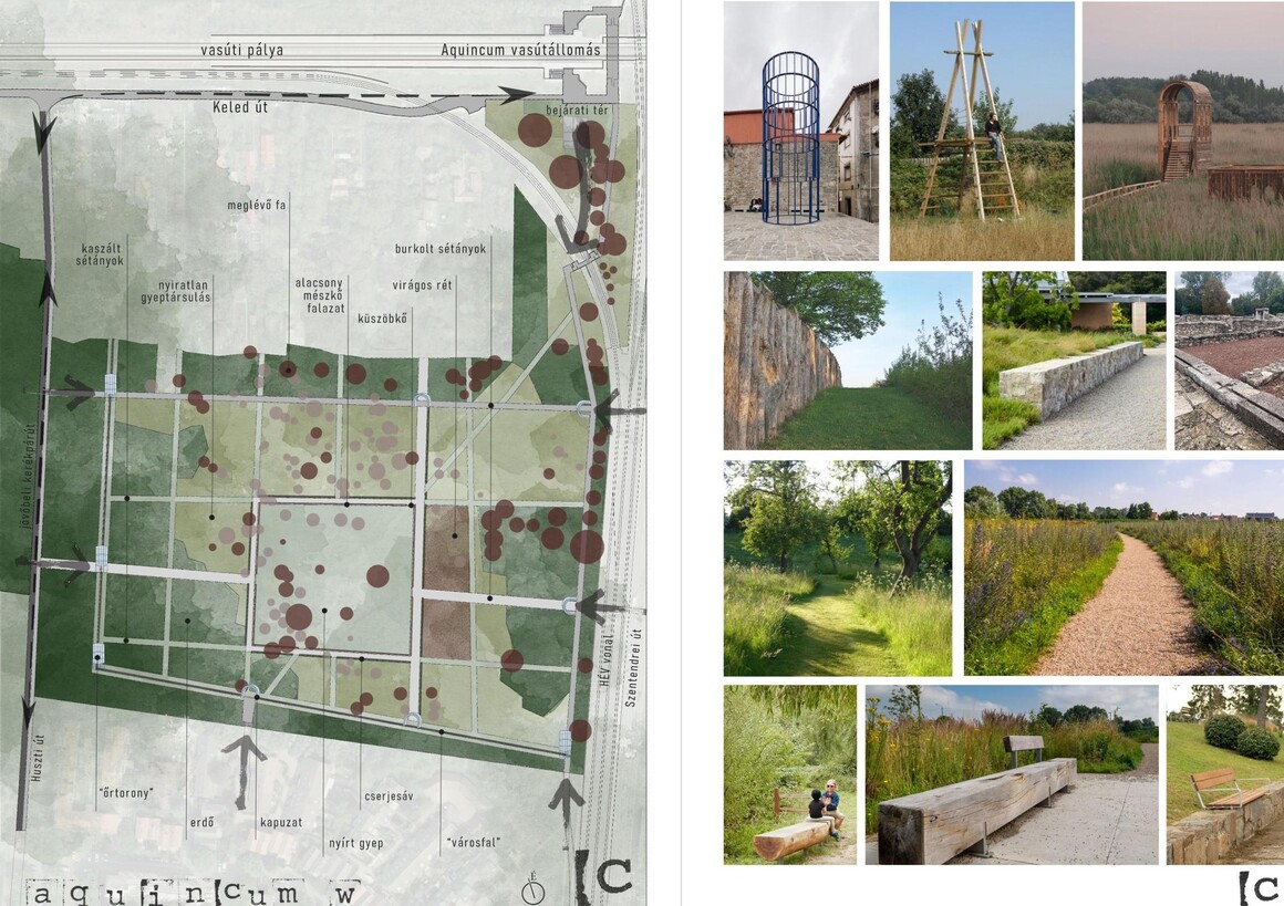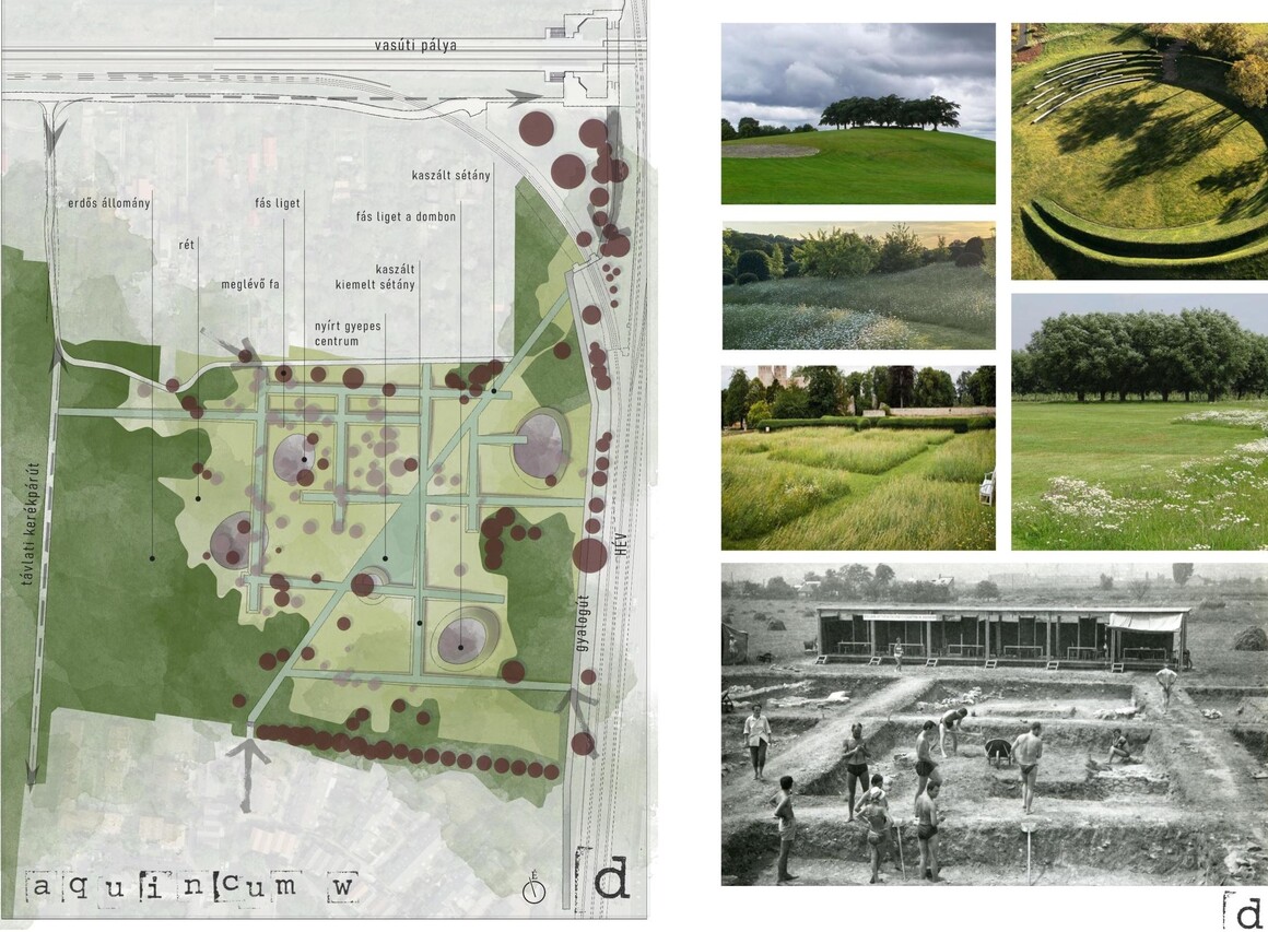 A park a jelenlegi kereszttengelynél két részre válik: a tengelytől északra az ’extenzív park’, ahol teljesen érintetlenül marad a természetes gyeptársulás és a ligetes cserjék. A tengelytől délre az intenzív park részben régészeti bemutatótér, központi fórum ülőfelületekkel a meglévő diófa körül, terepdombok fa telepítéssel, lelátók kerülnek kialakításra.