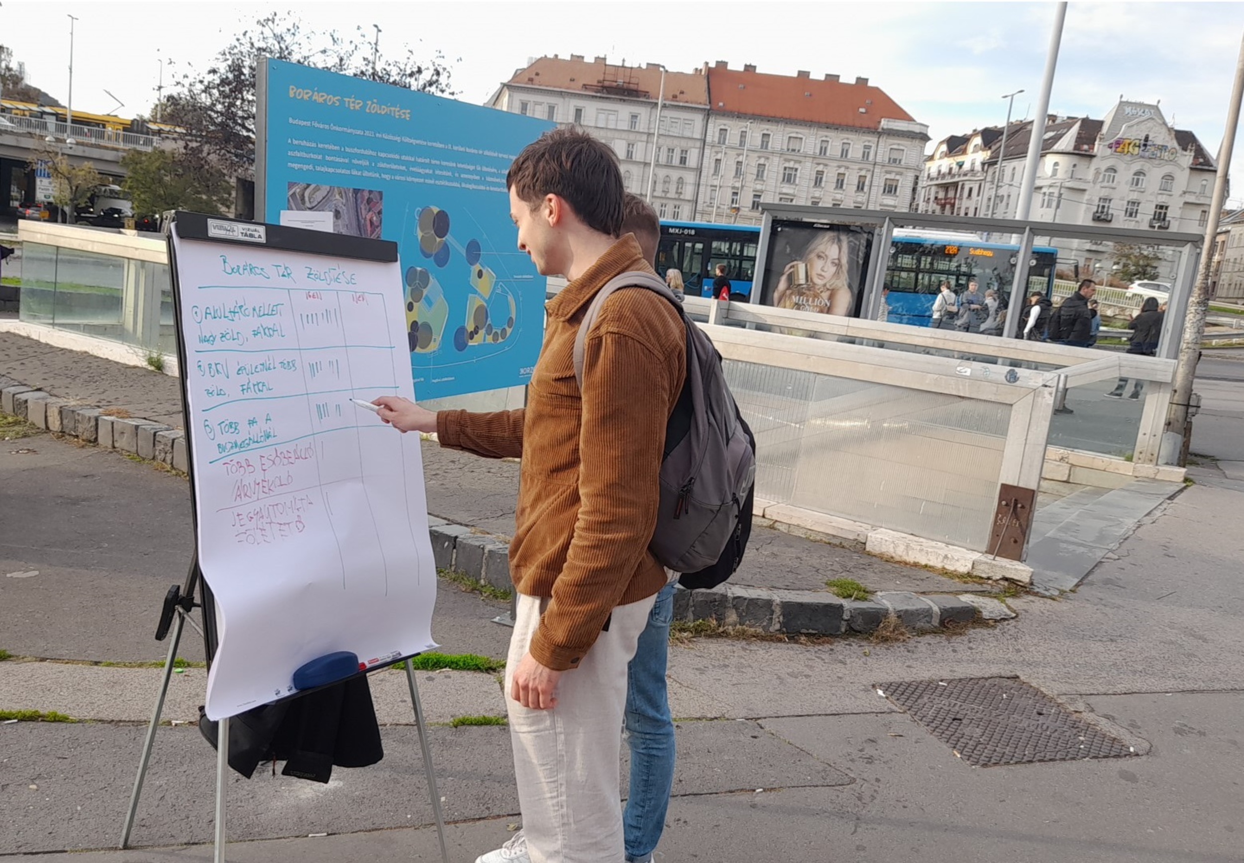 Az előre meghirdetett időpontban, október 14-én megtartottuk a Boráros tér tervezéséhez kapcsolódó helyszíni workshopot, ahol a Fővárosi Önkormányzat és a tájépítészeti tervezést végző Korzó stúdió munkatársai várták az érdeklődőket. Az eredményeket röviden úgy foglalhatjuk össze, hogy az eseményre kilátogató résztvevők, járókelők egyetértettek a zöldfelületek növelésével és a fák telepítésével.
