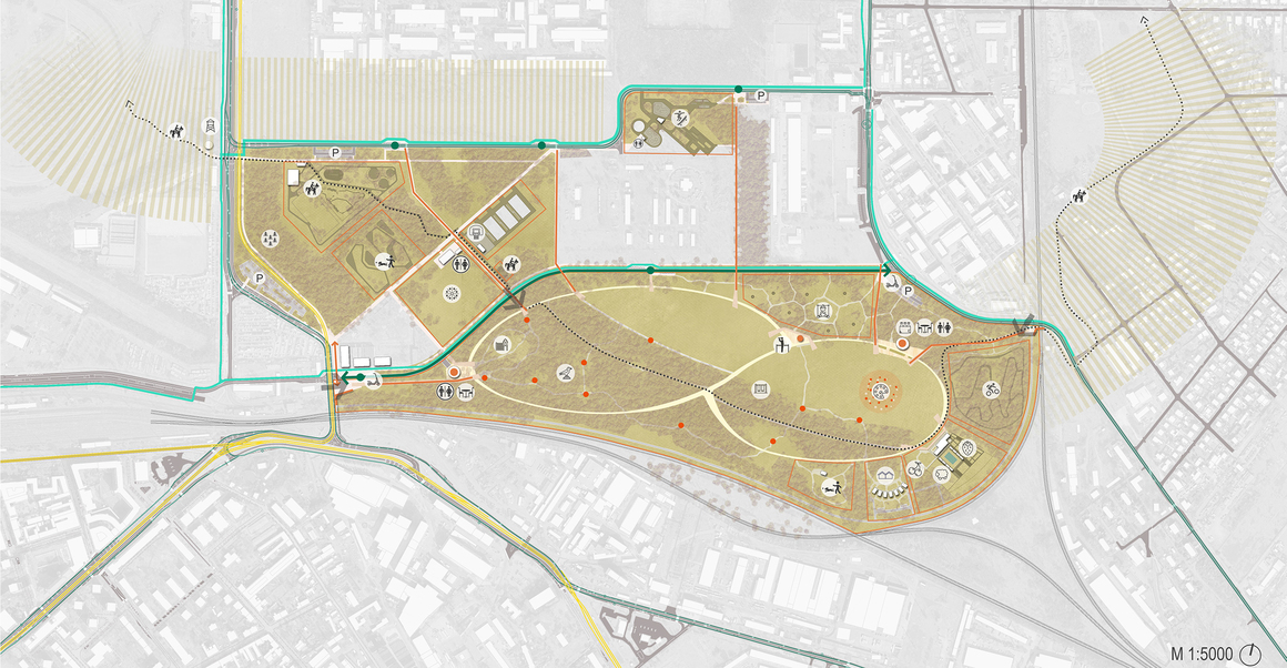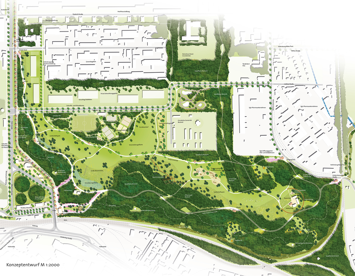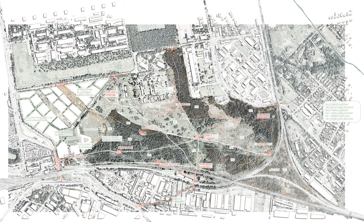 A „TERMÉSZET ÉS KÖZÖSSÉG RECONNECTING” (első és második tervlap) kialakítása átlátható térszerkezeti koncepcióval rendelkező zöldterület-kialakítást biztosít, amely jó tájékozódást biztosít. Az útrendszer következetesen fő- és mellékútra oszlik a terven. A terület központi részén nagy összefüggő nyílt, többfunkciós szabadtér jön létre, szélein erdős területekkel.