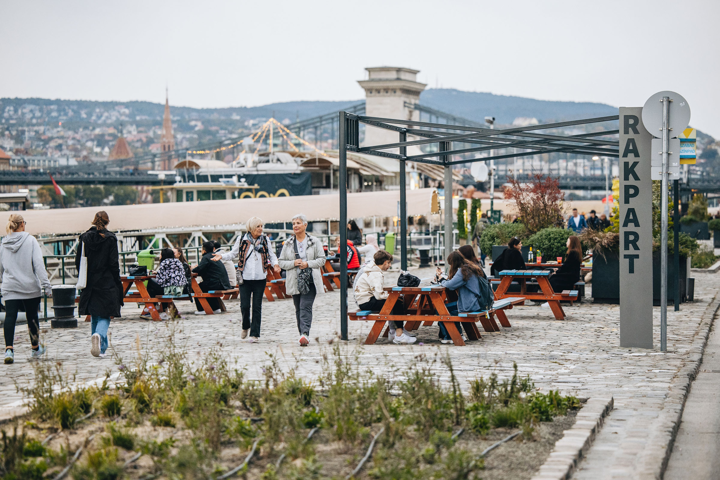Fák, évelők, árnyékolók, padok, napozószékek, kerékpártámaszok kihelyezésével vált még élhetőbbé a pesti alsó rakpart egy része.